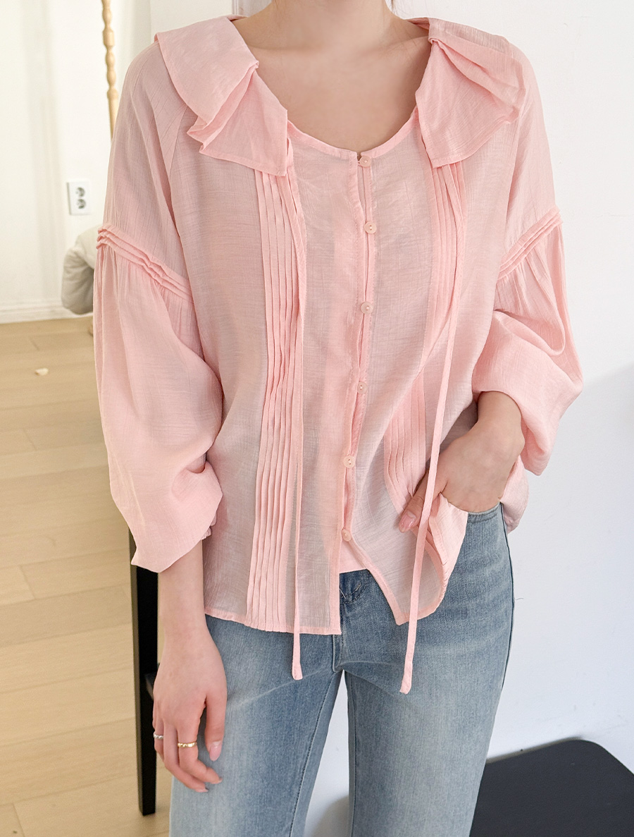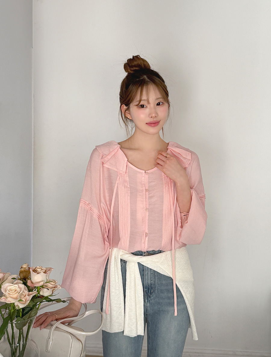 넥 프릴 디자인에 리본 스트랩 디테일을 넣어