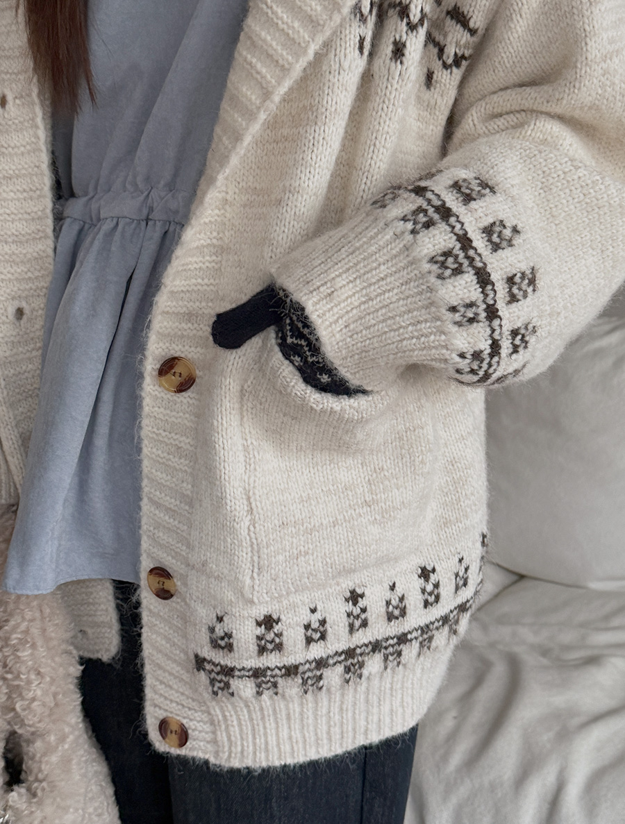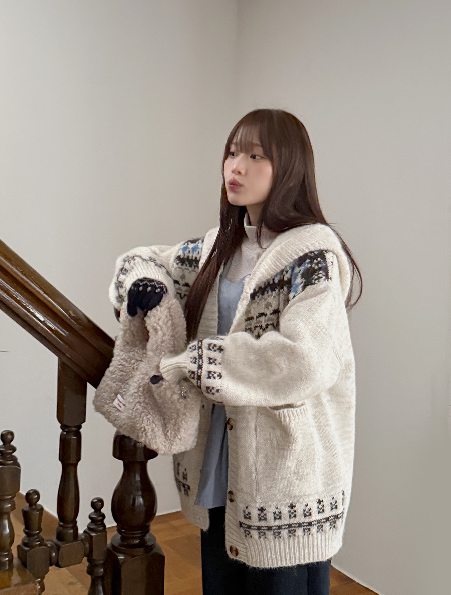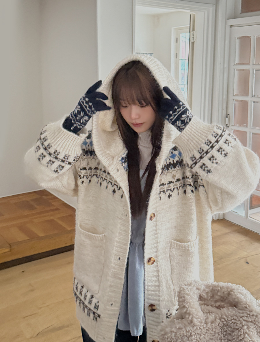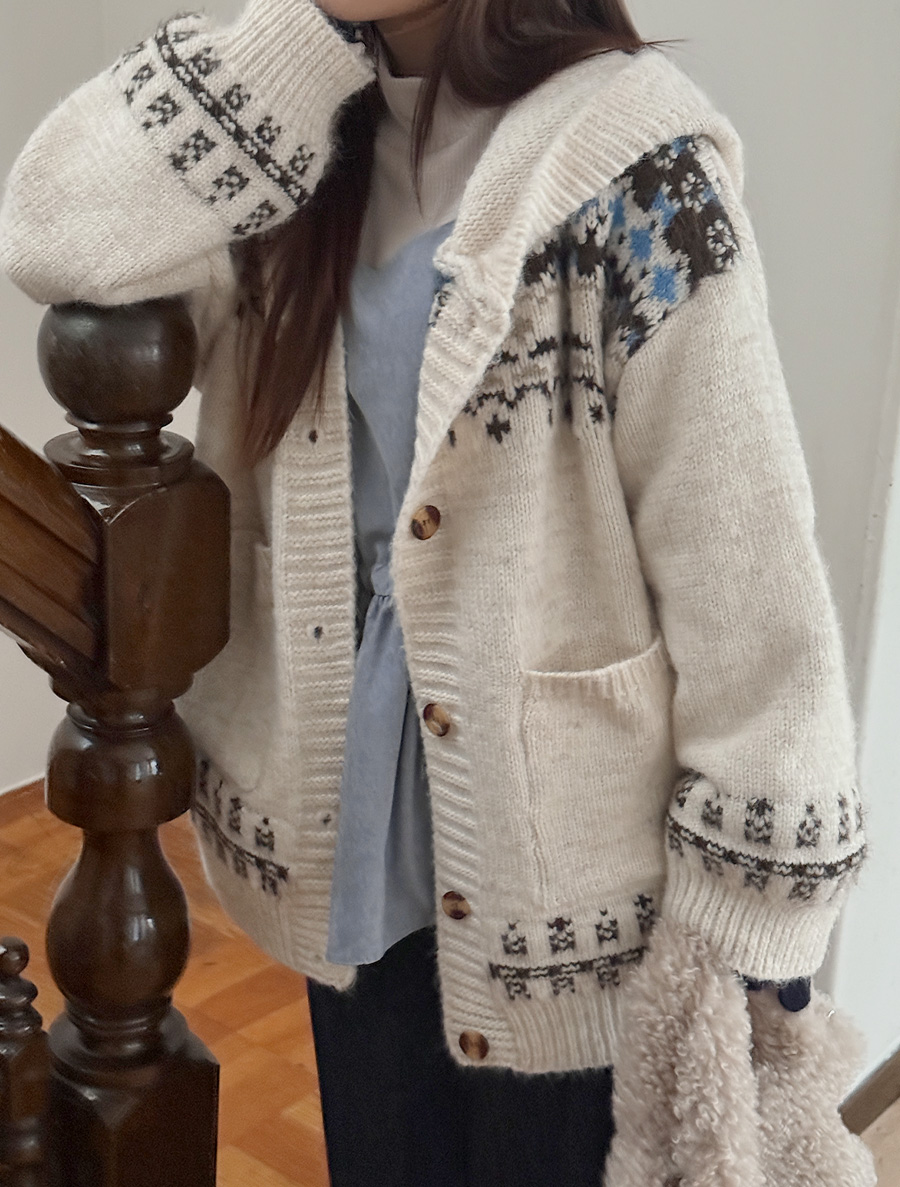ミピュアノルディックウールニットフードカーディガン