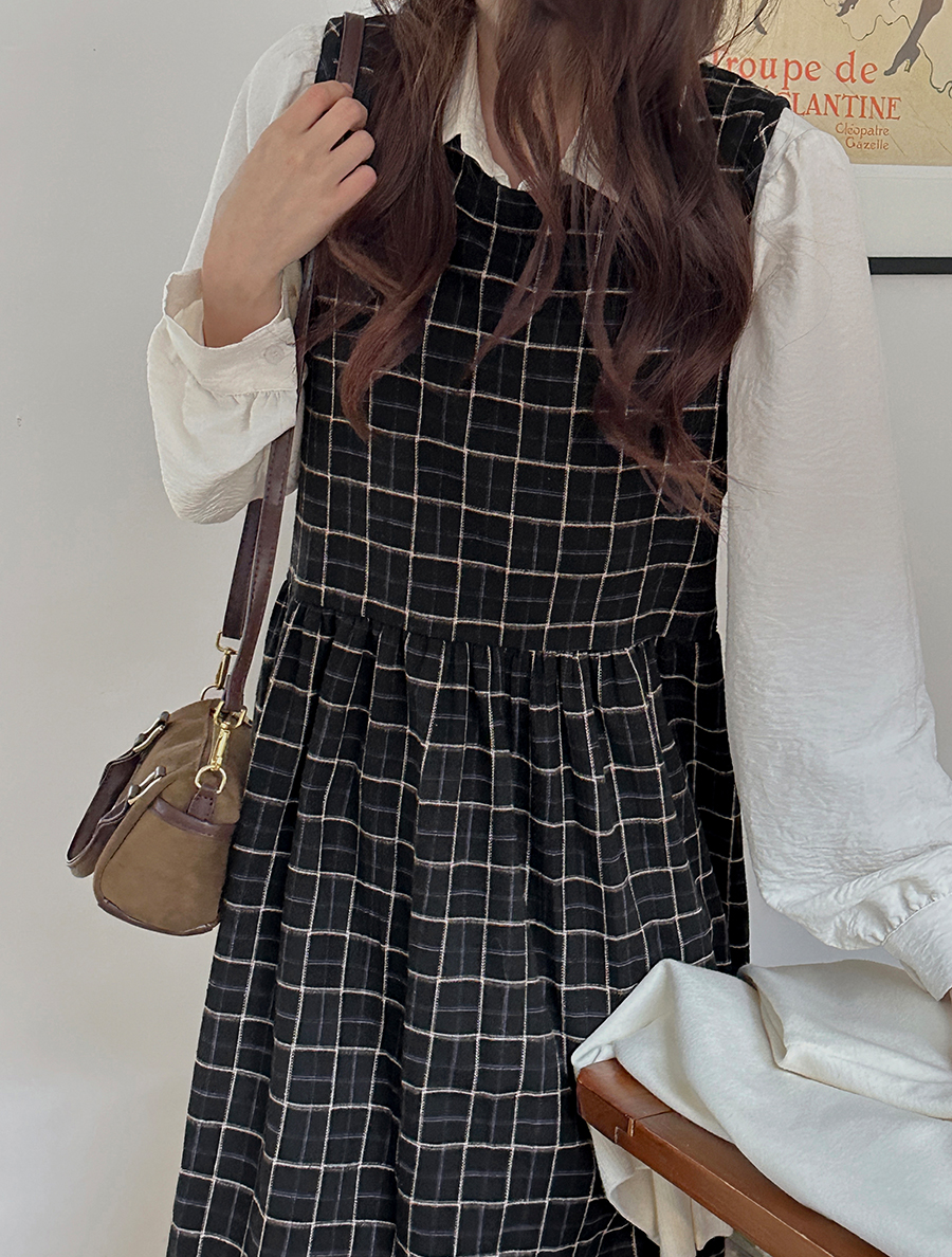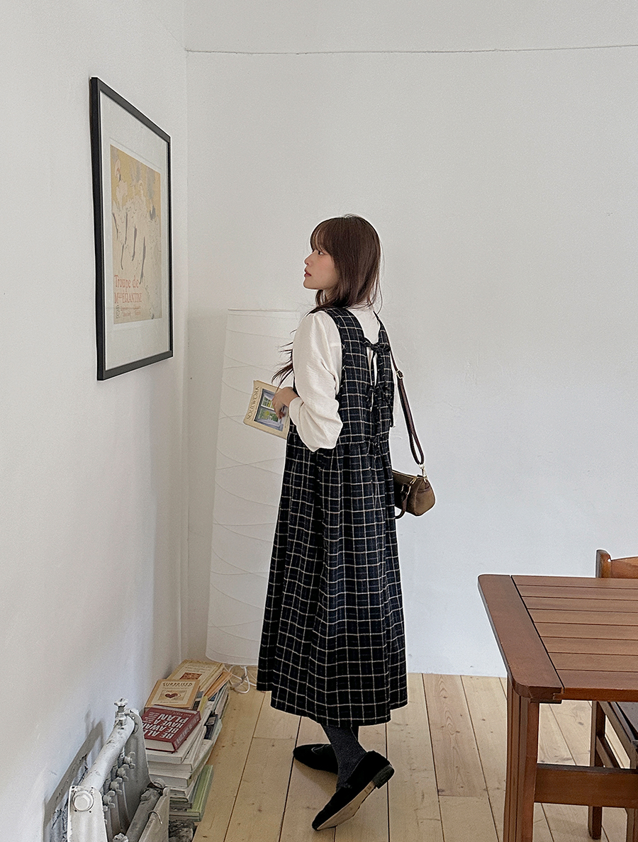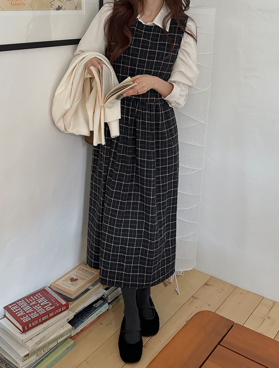 マエルトチェックシャーリングサスペンダーロングワンピース