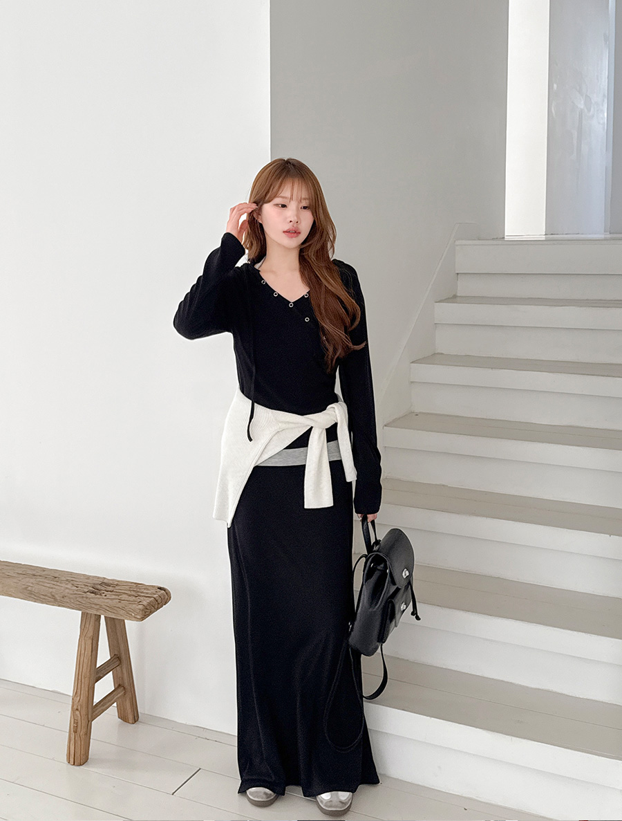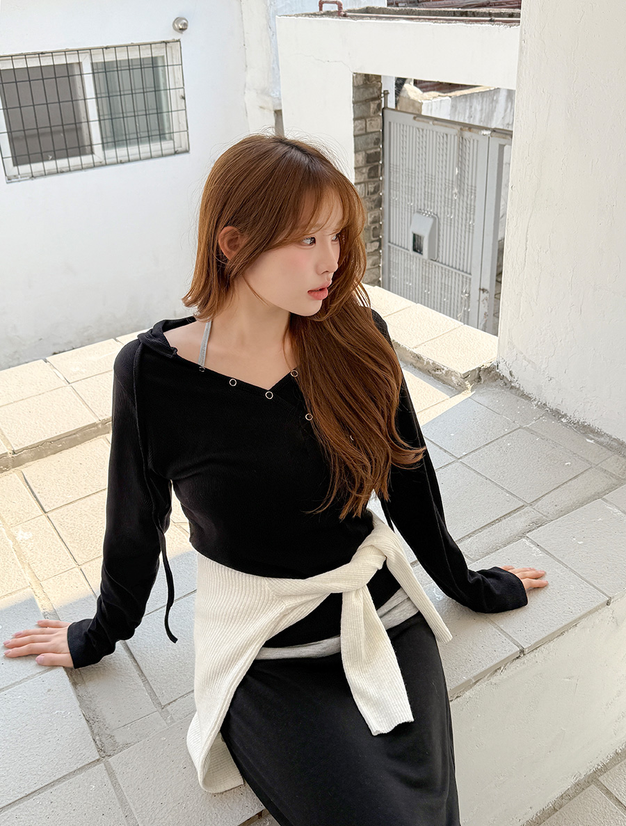 [EVELLET]リネアゴルジラップボタンフードティーシャツ